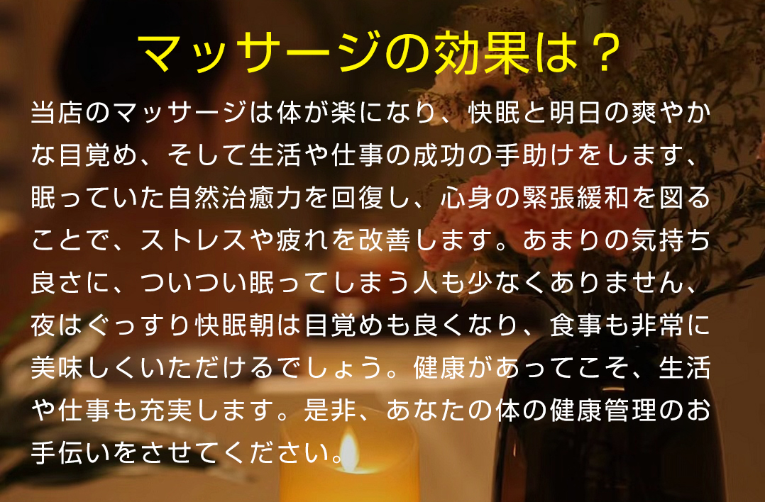 当店では、アロマオイルの効能と当店自慢のセラピストによるリンパマッサージの相乗効果による、癒しのひとときをお客様お一人お一人にお届けしております、自然で心やすらぐ優美な香りを、施術中はもちろんご帰宅お休みになってから翌日朝目覚めでまで楽しんで頂けます、どうぞゆっくりご堪能ください。